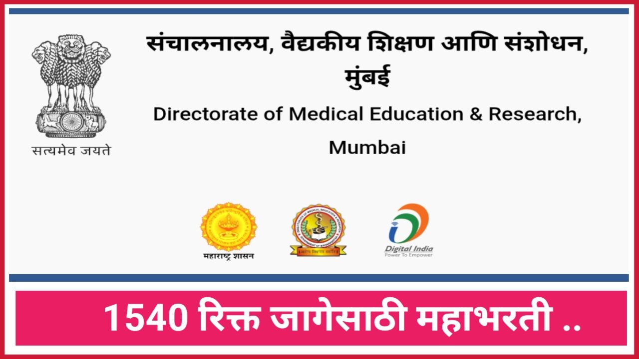 DMER : महाराष्ट्र राज्य वैद्यकीय शिक्षण व संशोधन संचालनालय अंतर्गत तब्बल 1540 रिक्त जागेसाठी महाभरती ; लगेच करा आवेदन .