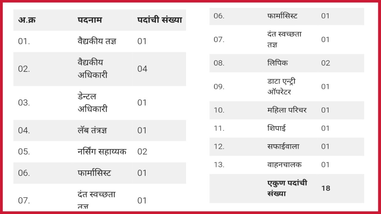 ECHS : माजी सैनिक सहयोगी आरोग्य योजना नागपुर अंतर्गत अधिकारी, फार्मासिस्ट , परिचर , चालक ,शिपाई ,लिपिक इ. पदांसाठी पदभरती ,प्रक्रिया राबविण्यात येत असून,पात्र उमेदवारांकडून विहीत कालावधीमध्ये , ऑफलाईन पद्धतीने आवेदन मागविण्यातयेत आहेत . ( ECHS NAGPUR RECRUITMENT FOR VARIOUS POST , NUMBER OF POST VACANCY – 18 ) रिक्त पदांचा सविस्तर तपशिल पुढीलप्रमाणे पाहुयात … Read more