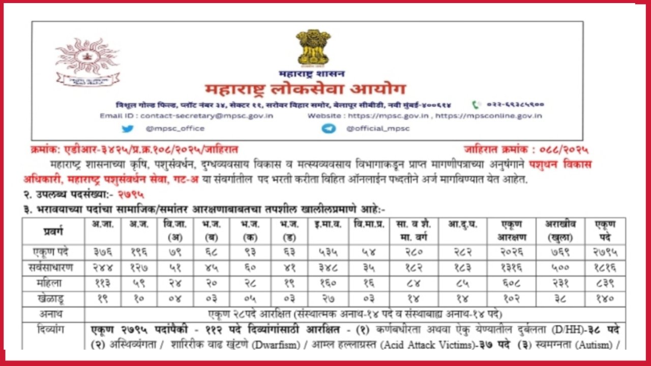 महाराष्ट्र राज्य पशुसंवर्धन विभाग अंतर्गत तब्बल 2795 रिक्त जागेसाठी महाभरती , प्रक्रिया राबविण्यात येत असून , सदर पदांकरीता आवश्यक अर्हता धारण करणाऱ्या उमेदवारांकडून विहीत कालावधीमध्ये , ऑनलाईन पद्धतीने आवेदन मागविण्यात येत आहेत . ( Maharashtra public service commission agriculture , animal husbandry department recruitment for live stock development officer post , number of post vacancy -2795 ) रिक्त पदांचा सविस्तर तपशिल पुढीलप्रमाणे पाहुयात .