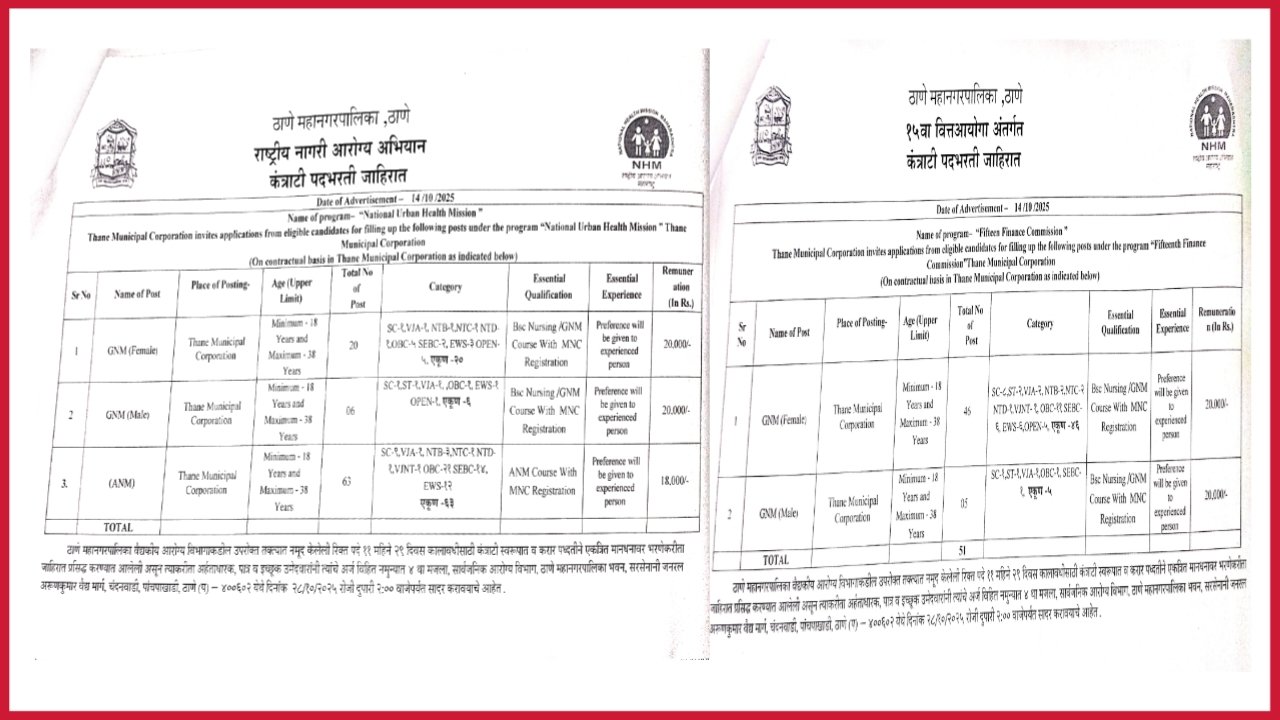 अर्ज प्रक्रिया : पात्र उमेदवारांनी आपले आवेदन हे ऑफलाईन पद्धतीने चौथा मजला सार्वजनिक आरोग्य विभाग , ठाणे महानगरपालिका इमारत , सरसेनानी जनरल अरुण कुमार वैद्य मार्ग , चंदनवाडी पाचपाखाडी ठाणे 400602 या पत्यावर दिनांक 28.10.2025 पर्यंत सादर करायचे आहेत .
