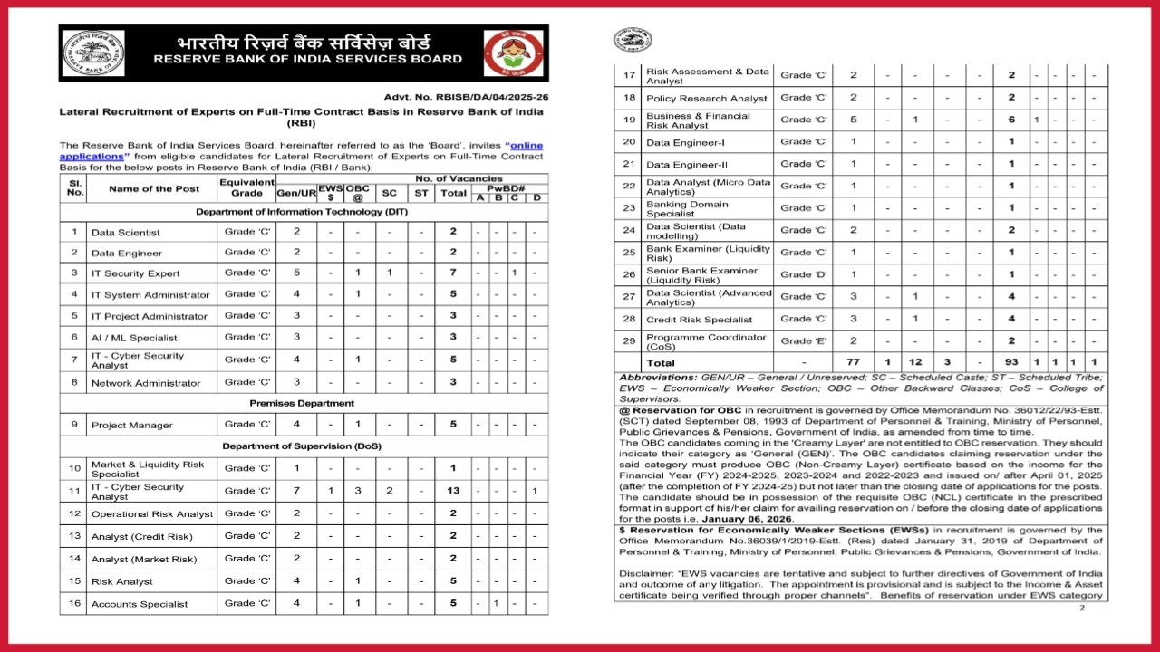 पदनाम / पदांची संख्या ( Post Name / Number of post ) : यांमध्ये डाटा सायंटिस्ट , डाटा अभियंता , आयटी सुरक्षा तज्ञ , सायबर सुरक्षा अनॉलिटिक्स , नेटवर्क प्रशासक , प्रकल्प व्यवस्थापक , मार्केट व लिक्वीड अधिकारी , ऑपरेशनल रिस्क अधिकारी , लेखा अधिकारी इ . गट क संवर्गातील एकुण 93 रिक्त जागेसाठी पदभरती प्रक्रिया राबविण्यात येत आहेत .