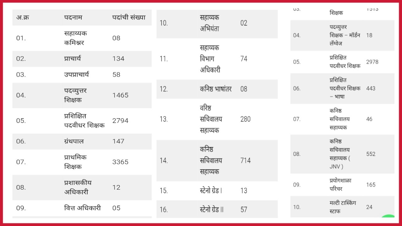 केंद्रीय विद्यालय नांदेड व छ.संभाजीनगर येथे विविध शिक्षक / शिक्षकेत्तर कर्मचारी पदांसाठी पदभरती , प्रक्रिया राबविण्यात येत असून , सदर पदांकरीता आवश्यक अर्हता धारण करणाऱ्या उमेदवारांची थेट मुलाखतीद्वारे निवड प्रक्रिया राबविण्यात येत आहे . ( Kendriy vidyalay recruitment for various teaching & non teaching post ) 01.नांदेड केंद्रीय विद्यालय पदभरती : केंद्रीय विद्यालय अंतर्गत पीजीटी … Read more