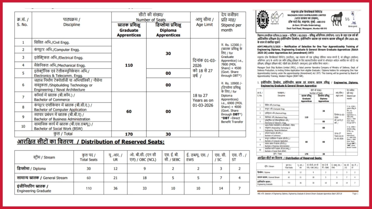 माझगाव डॉक शिप-बिल्डर्स लिमिटेड मुंबई अंतर्गत विविध पदांच्या 200 पदांसाठी पदभरती ; लगेच करा आवेदन .