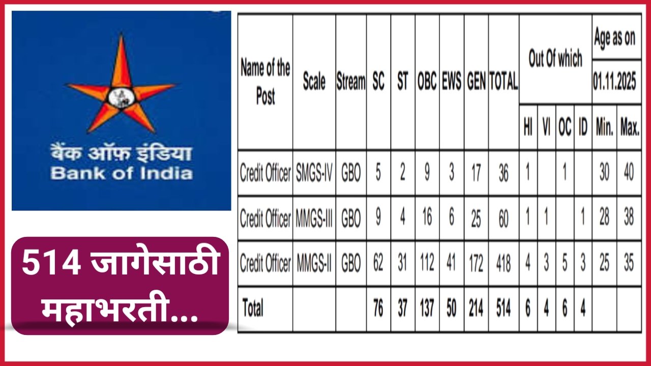 BOI : बँक ऑफ इंडिया अंतर्गत तब्बल 514 रिक्त जागेसाठी महाभरती ; लगेच करा आवेदन .