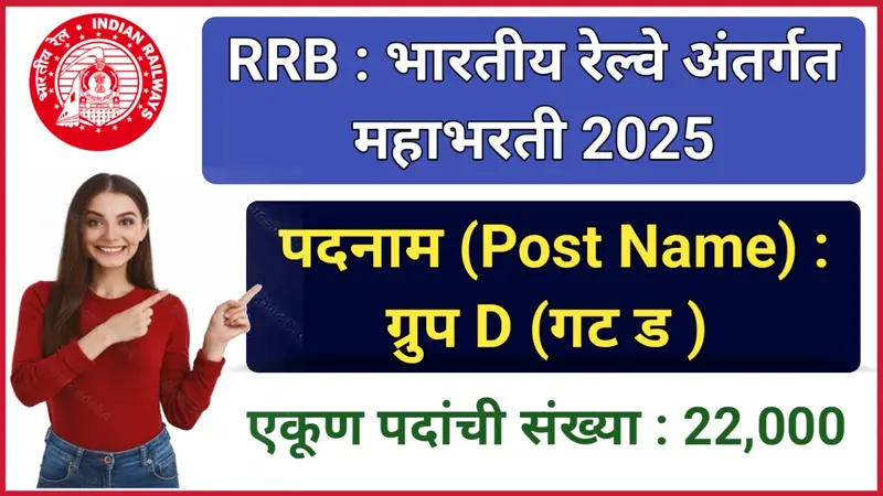 RRB : भारतीय रेल्वे अंतर्गत ग्रुप डी ( Group D ) पदाच्या तब्ल 22000 रिक्त जागेसाठी महाभरती !
